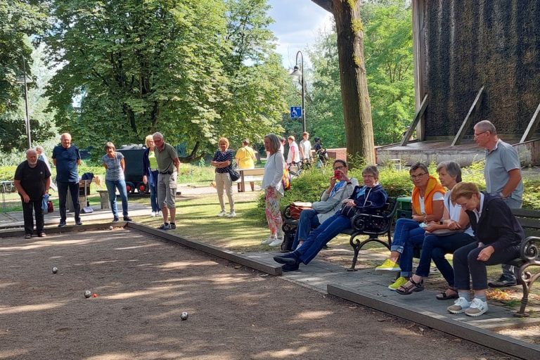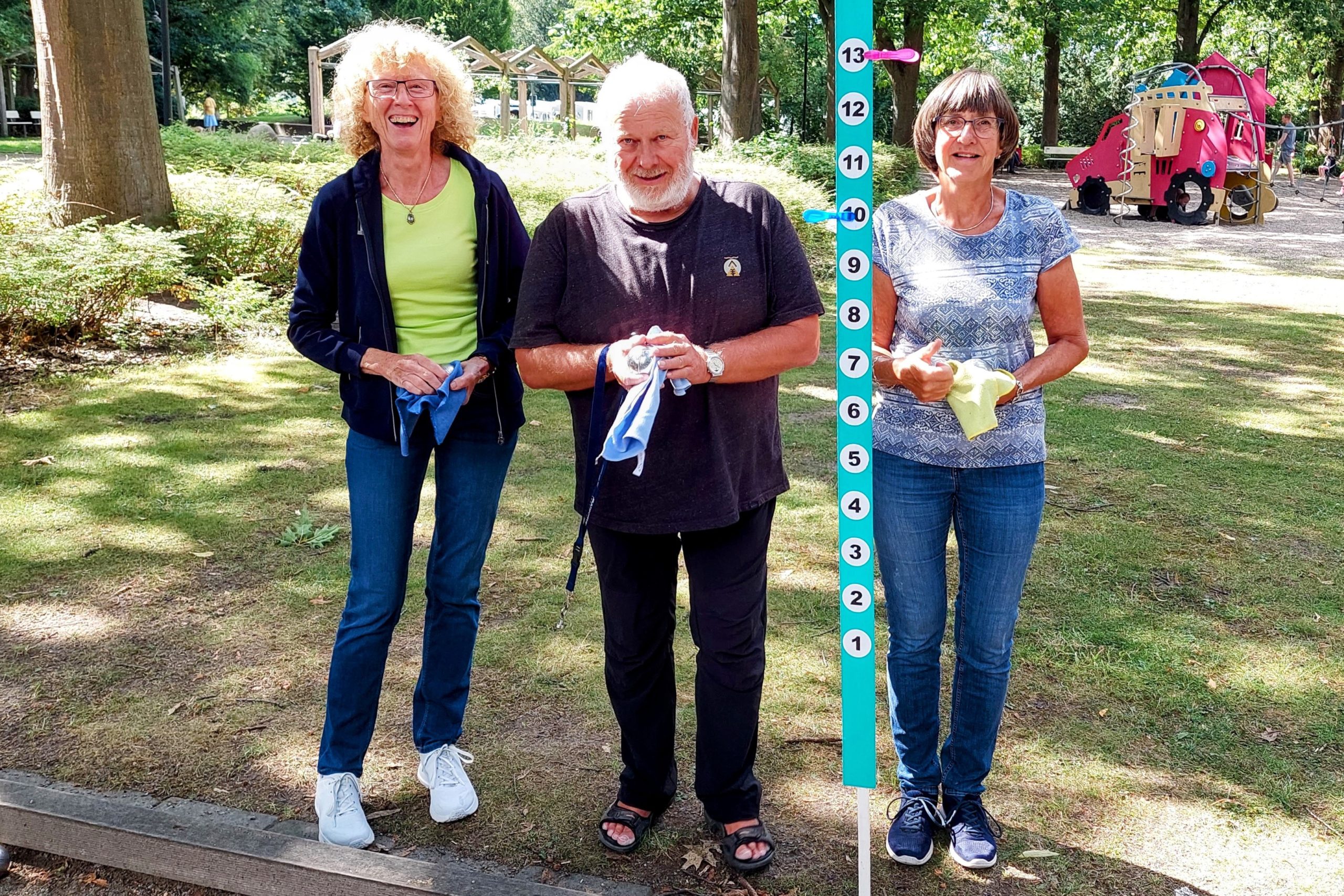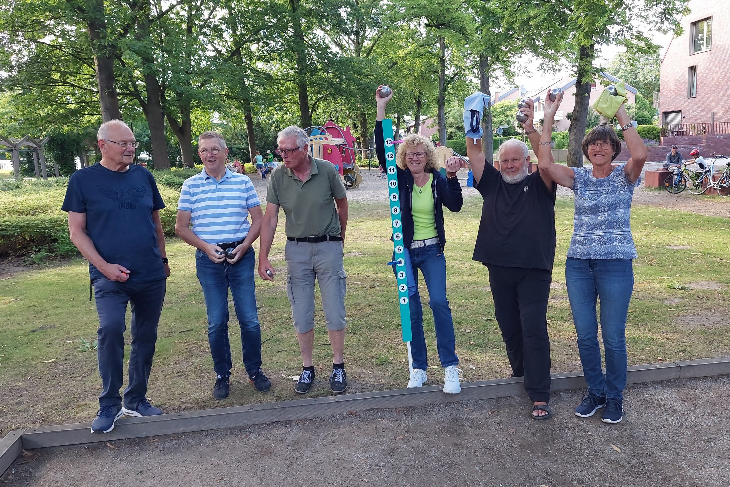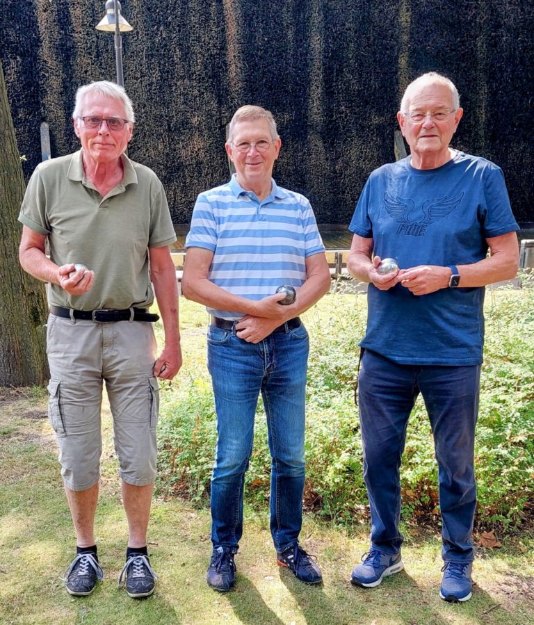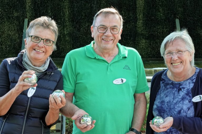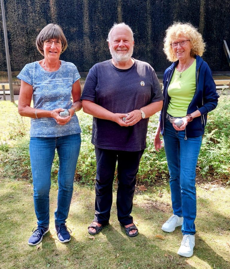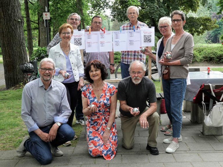 In diesem Jahr veranstaltete die ZWAR-Boule-Gruppe erstmalig ein Boule-Turnier. Auftakt des Turniers war die mit Spannung erwartete Auslosung der Teams. Wer spielt mit wem? – Das war die entscheidende Frage vor Turnierbeginn. Aus den 25 angemeldeten Turnierteilnehmern wurden per Los acht Teams mit jeweils drei Spieler/innen zusammengestellt. Der 25. Turnierteilnehmer wurde am Schluss dem Team 5 zugelost. Die roten Loskugeln zog Barbara, die ihren Job als Glücksfee mit Bravour erledigte. Nicht minder erfolgreich war Renate, die die Ziehungen protokollierte und sorgsam darauf achtete, dass alles mit rechten Dingen zuging.