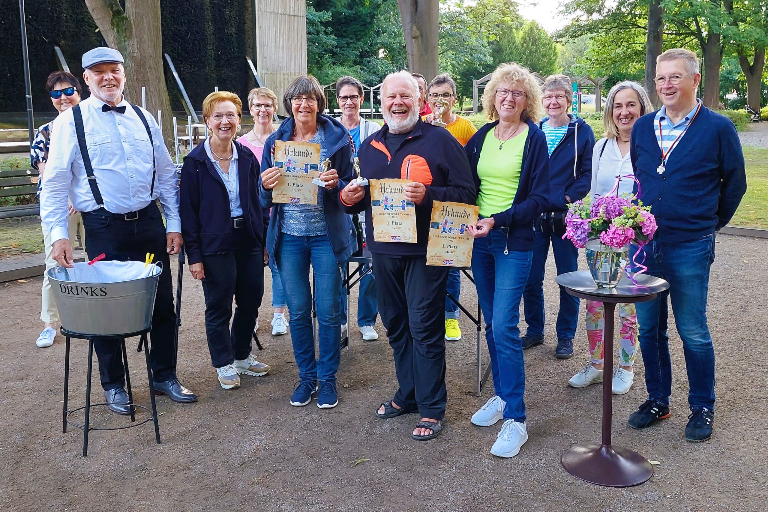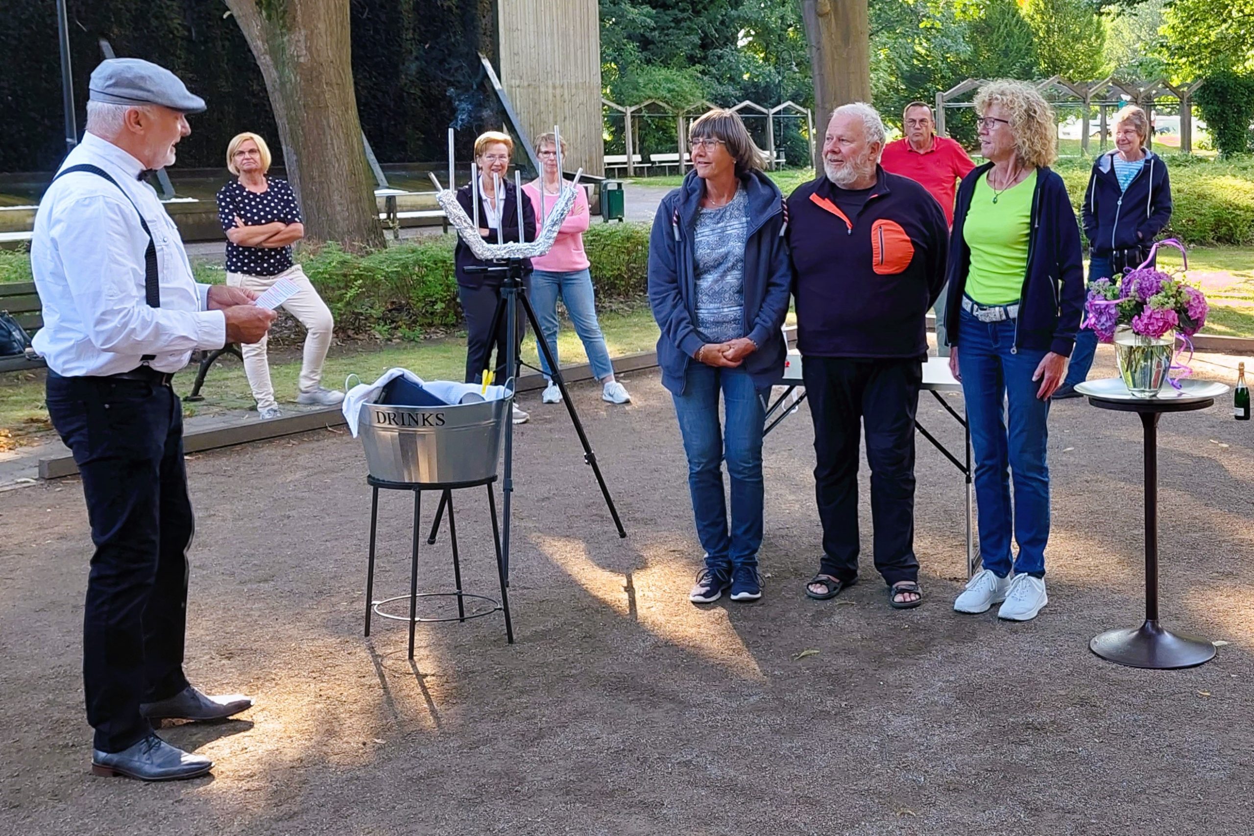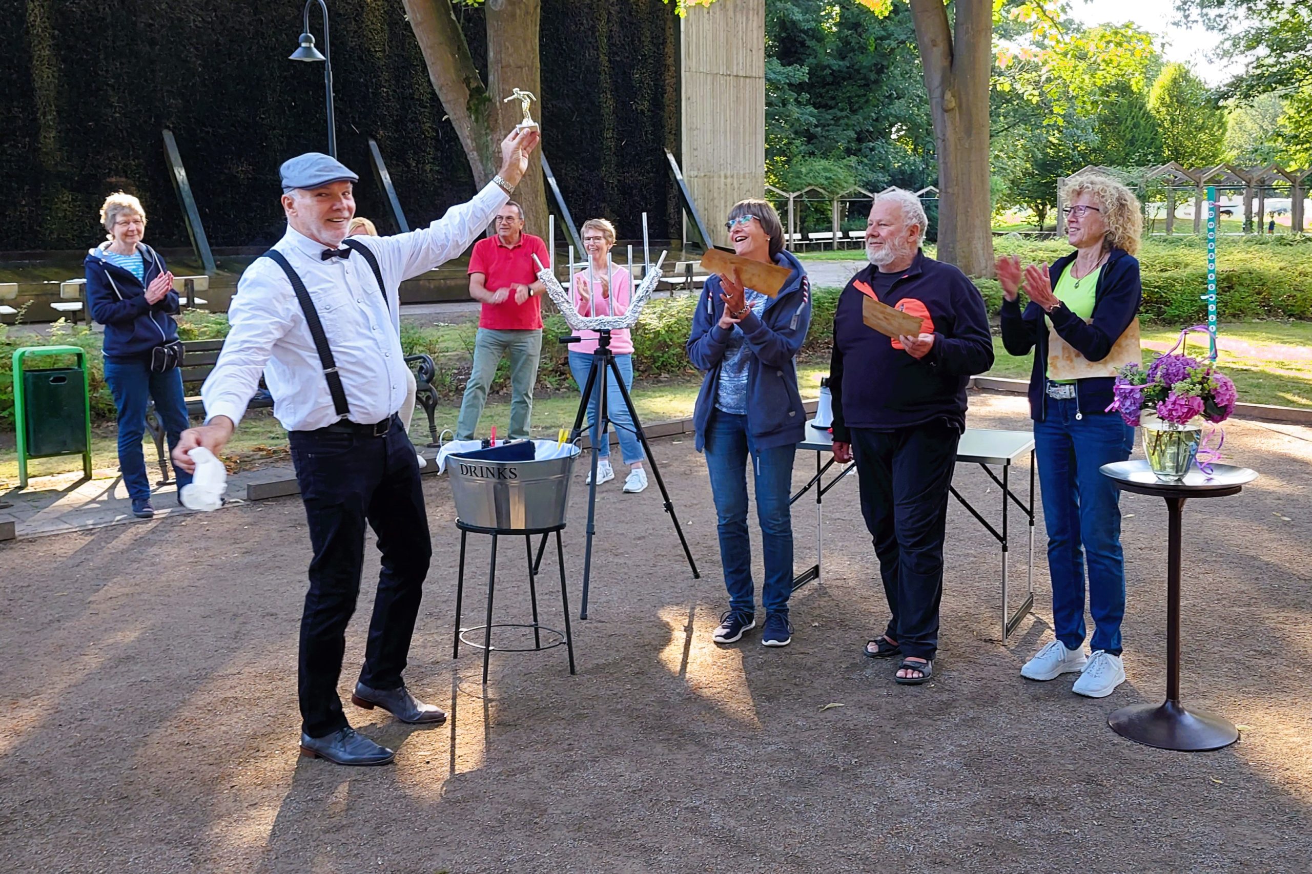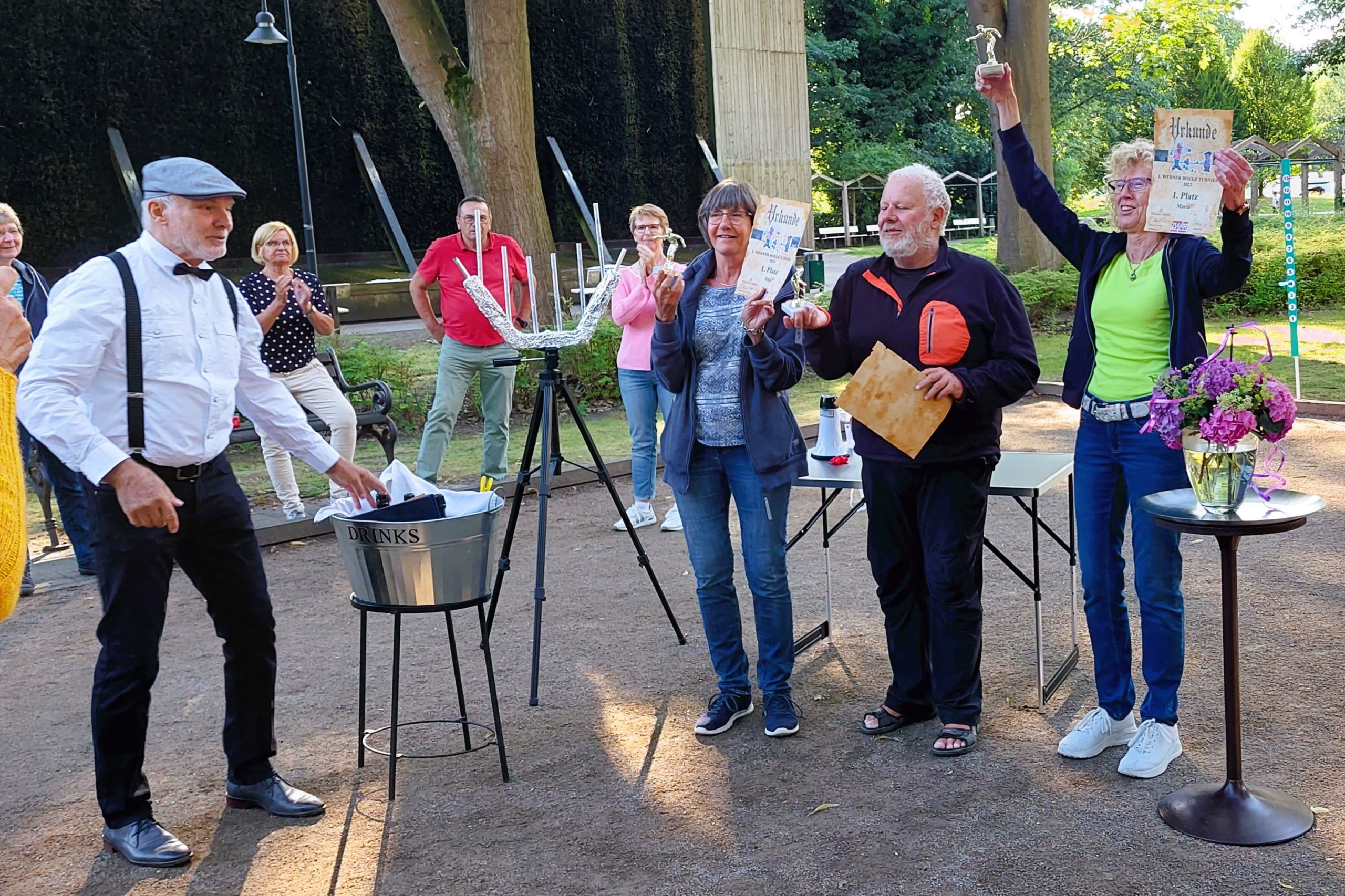 Die Siegerehrung nahm Peter vor, der sich als Meister seines Faches erwies und bei der Übergabe der Preise an die Siegerteams zur Hochform auflief. Die Teammitglieder des Siegerteams erhielten neben einer Urkunde einen Pokal, der mittlerweile nachweislich bei den Empfängern den Weg in (z. T. erleuchtete) Vitrinen gefunden hat. Die zweiten Sieger vom Team 6 erhielten neben einer Urkunde eine Medaille, die hoffentlich demnächst auf der Boule-Bahn näher in Augenschein genommen werden kann. Für eine echte Überraschung sorgte dann ein kleines Feuerwerk als krönender Abschluss der Siegerehrung.